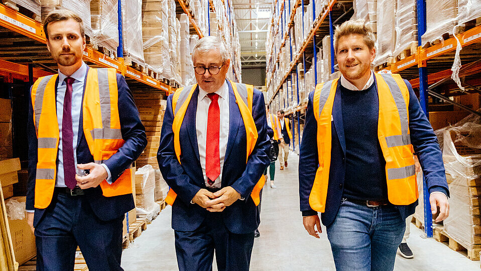 Neben unseren langjährigen Wegbegleitern fanden sich unter den Gästen Dr. Jürgen Ude (Staatssekretär für Strukturwandel und Großansiedlungen in Sachsen-Anhalt), Hartmut Handschak (Landrat Saalekreis) und Steffen Kunnig (Bürgermeister von Kabelsketal) ein. Martin begann mit einem Rückblick auf die vergangenen Jahre und die Teamleistungen, durch welche Relaxdays vom Ein-Mann-Betrieb zu Mitteldeutschlands größtem E-Commerce-Player wurde. Im Anschluss konnten sich die Gäste selbst von der Größe des Logistikzentrums überzeugen. Bei Führungen durch die Lagerfläche gab es auch den ersten Eindruck von unserer Sorter-Anlage. Die sich noch im Bau befindliche Anlage wird zukünftig unsere Versandmitarbeiter unterstützen, so dass Relaxdays perspektivisch in der Lage sein wird, bis zu 10.000 Pakete in der Stunde zu versenden.